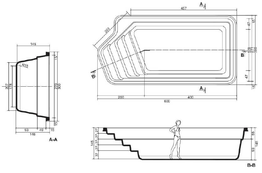 Brand: AstralPool,Voltage, V: 690,Power consumption, kW: 0.25,Flow rate, m3/h: 7 Category: Luxe pool Tobe fiberglass swimming pool, 6 x 3 x 1,45 m