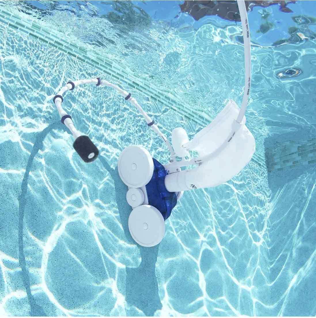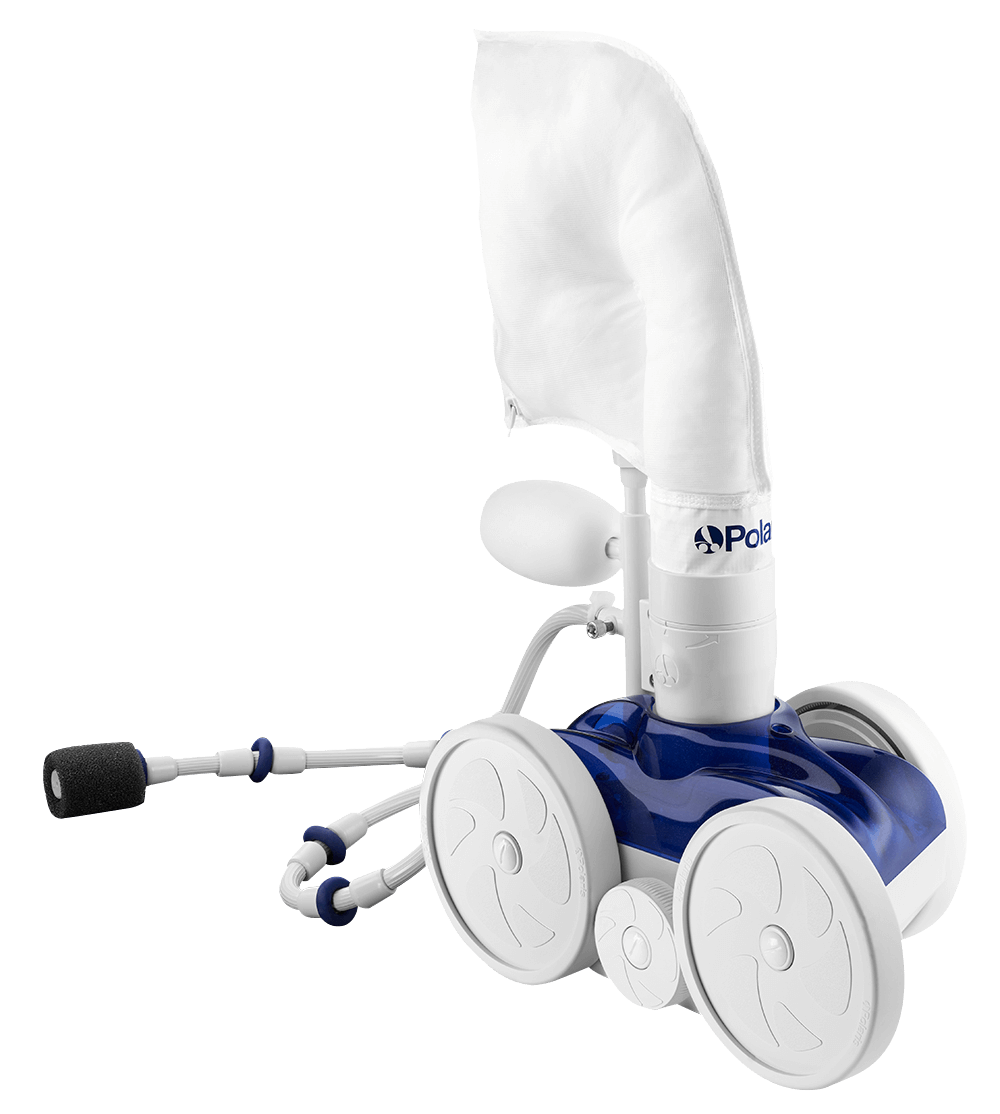 The Polaris 280 Pressure Automatic Pool Cleaner has a universal wall fitting (UWF), quick disconnect, in-line filter assembly, back-up valve, 31 feet of hose with hose floats and swivels, and an all-purpose zippered bag.