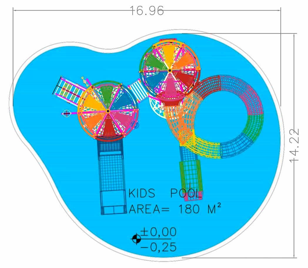 The children's pool concept with the Splash Tower in the middle of the pool helps to distribute the children throughout the pool area. This is a more advantageous children's area concept as opposed to the pool perimeter option. In pools where the rides are located on the sides of the pool, the middle is usually empty.