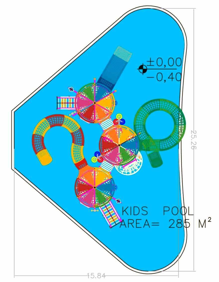 The children's pool concept with the Splash Tower in the middle of the pool helps to distribute the children throughout the pool area. This is a more advantageous children's area concept as opposed to the pool perimeter option. In pools where the rides are located on the sides of the pool, the middle is usually empty.