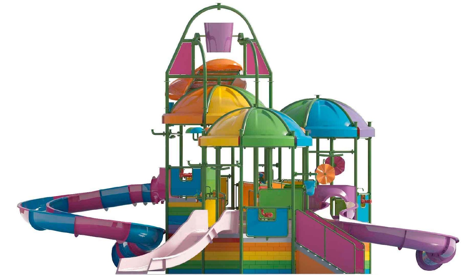 Children's area of a modern water-entertainment complex will necessarily include a playground, not depending on whether it is a separate complex, aimed at leisure or aquazone at the hotel, or beach... Playgrounds in our time should include a lot of interactive elements that can attract children for a long time: water slides with different trajectory of descent, color and sound effects, bucket, which flips when filled, shooting jets and sprays of water in the form of various figures ... Such playgrounds are called - SPLASH TOWER.