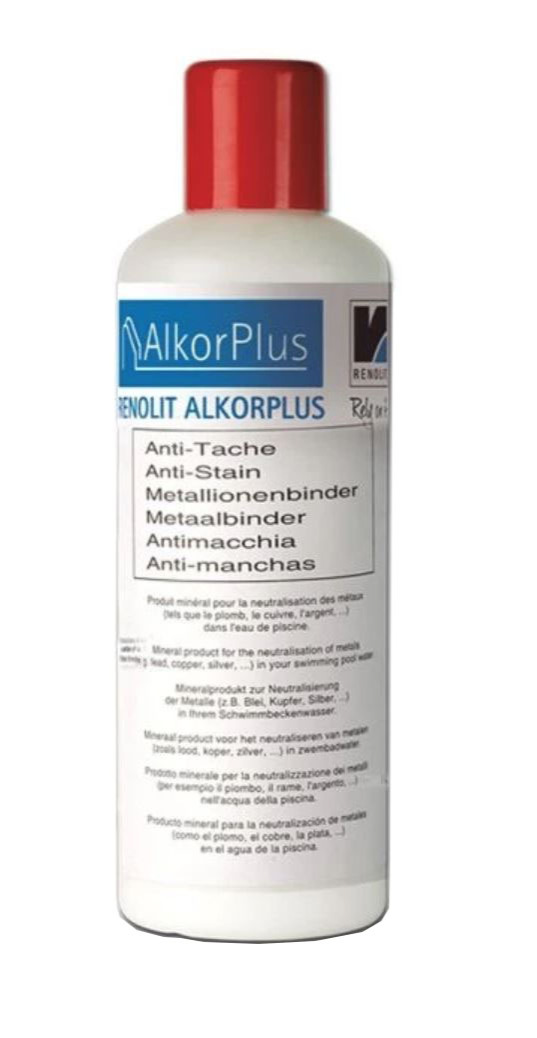 Renolit ALKORPLUS stain remover is a powerful cleaning solution designed to prevent the formation of stains caused by metal ions, such as copper, in pool and spa water. When metal ions such as copper are present in the water, they can react with other chemicals and cause unsightly stains on the pool or spa's surfaces.