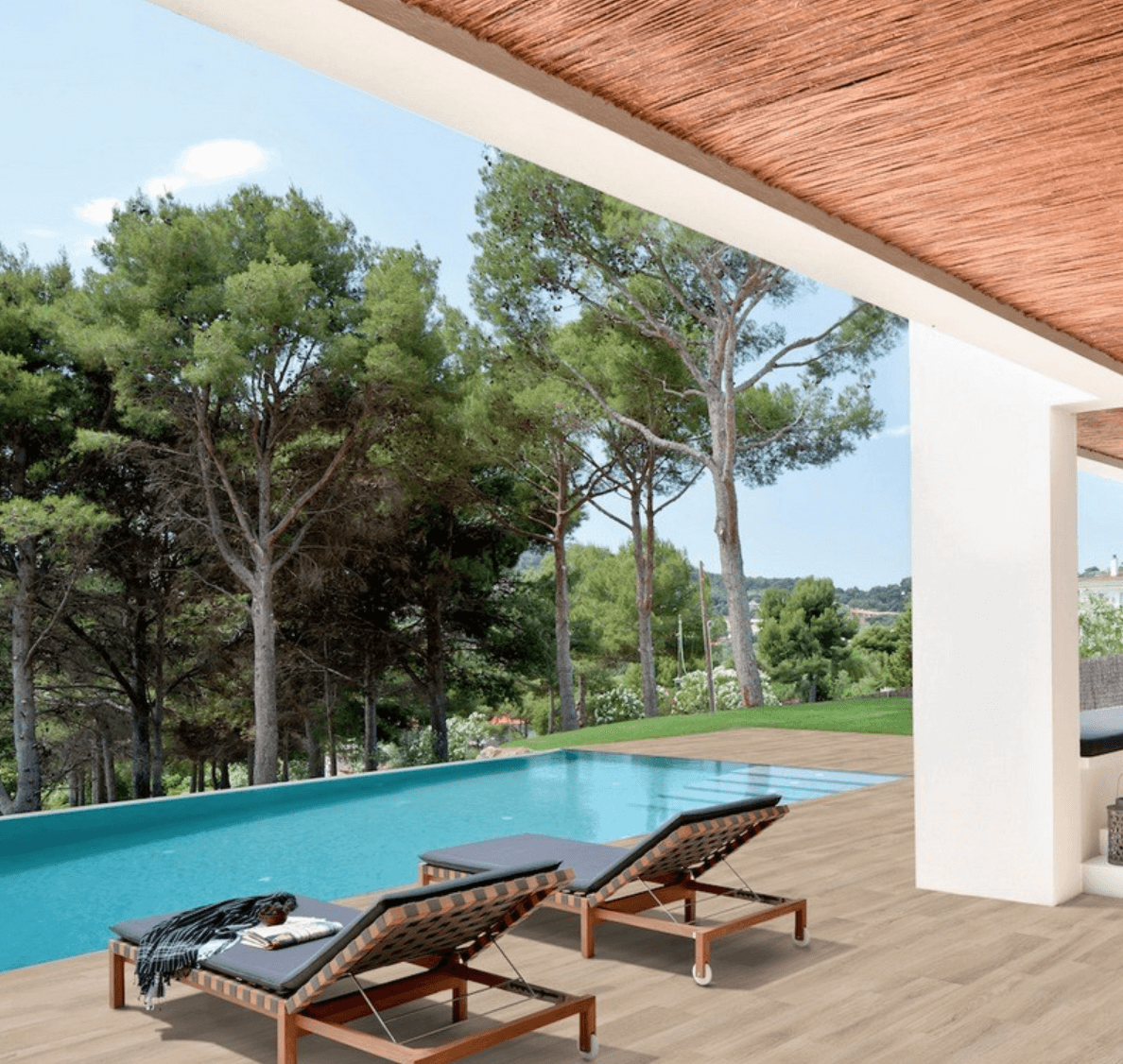 High-end porcelain tiles in the Alma collection have finishes inspired by the beauty of real wood. Even the smallest details on the surface seem lifelike. An excellent tile for outdoor recreation areas like pools. Rosa Gres Alma Pure is a wood-textured porcelain stoneware tile that is a perfect choice for anyone looking to add a touch of elegance to their swimming pool area. The tile's wood texture brings a natural and organic feel, while the porcelain stoneware material provides durability, slip-resistance, and low maintenance. The wood-textured design of Rosa Gres Alma Pure tile is an exceptional feature that creates a unique and warm atmosphere in your pool area. The texture of the tiles mimics the look and feel of real wood, without the maintenance or durability concerns. The natural and earthy look of the tile creates an inviting ambiance around the pool, making it a great place to relax and unwind. The Alma Pure wood-textured tile is available in different sizes and shades, making it customizable to any pool design or personal preference. The tile is versatile and can be used for pool decks, walkways, or poolside walls. The warm and inviting look of the tile creates a cozy and relaxing atmosphere, making it perfect for pool areas and outdoor living spaces.