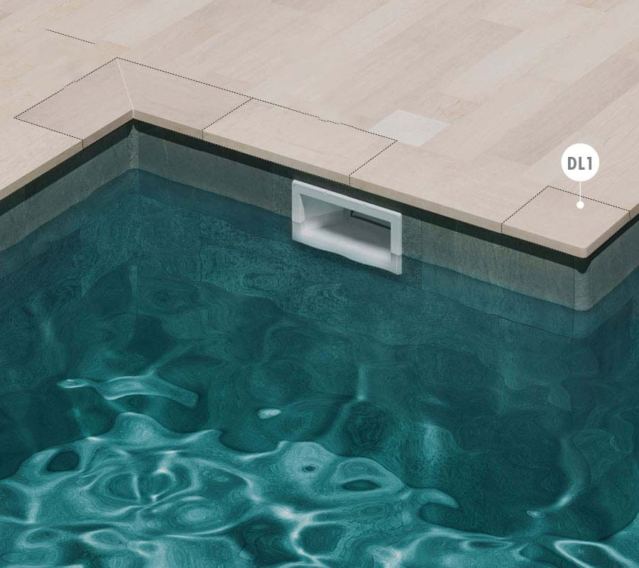 This DL1 staircase piece can be utilized both inside and outside as a corner or end of a stair step, a window sill, or a corner of a terrace or balcony. Additionally, it is utilized within the pool for the inner corner of the seat and the inner corner of the step.