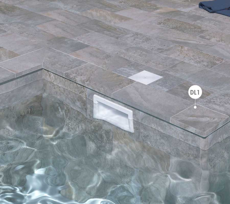 This DL1 staircase piece can be utilized both inside and outside as a corner or end of a stair step, a window sill, or a corner of a terrace or balcony. Additionally, it is utilized within the pool for the inner corner of the seat and the inner corner of the step.