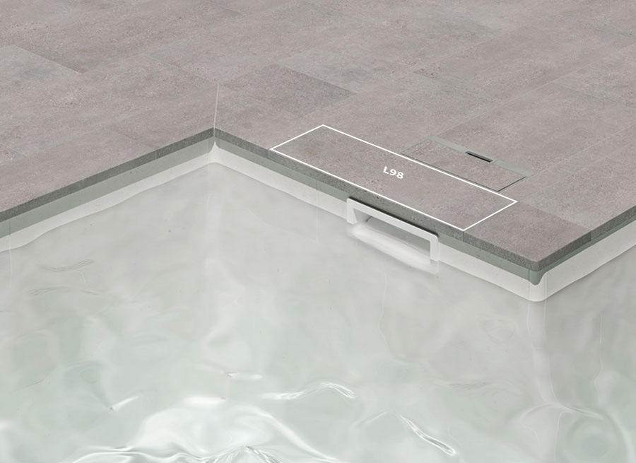 It is a component of both the Smart edge system and the Skimmer edge system type L. It is used near the inside corner of the pool's edge. Both private and public pools (in hotels, aquaparks, wellness centres, and spas) can use this type of equipment.