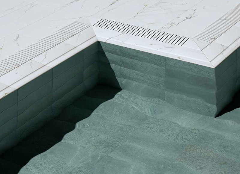 Acclaimed to improve the beauty of your pool with a wide range of varieties in color and design. The design of this corner piece is also noteworthy, featuring a sleek and modern look with a neutral color palette that can complement a variety of pool designs and aesthetics. The subtle texture of the porcelain adds a touch of elegance and sophistication to the pool area, creating a luxurious and refined atmosphere.Overall, the Rosa Gres Mythos Selene 245 EC porcelain corner is an excellent choice for those seeking a durable, safe, and stylish option for their infinity swimming pool. Its high-quality construction, slip-resistant surface, and elegant design make it a top choice among pool designers and homeowners alike. With the addition of this stunning corner piece, any infinity swimming pool can be transformed into a luxurious and inviting oasis.