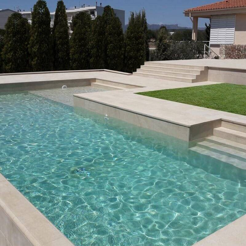 Rosa Gres Mistery Sand 665 porcelain stoneware edge for swimming pool, 62,6 x 62,6 x 2,6 cm, anti-slip Rosa Gres Mistery Sand 665 porcelain stoneware edge for swimming pool, 62,6 x 62,6 x 2,6 cm, anti-slip