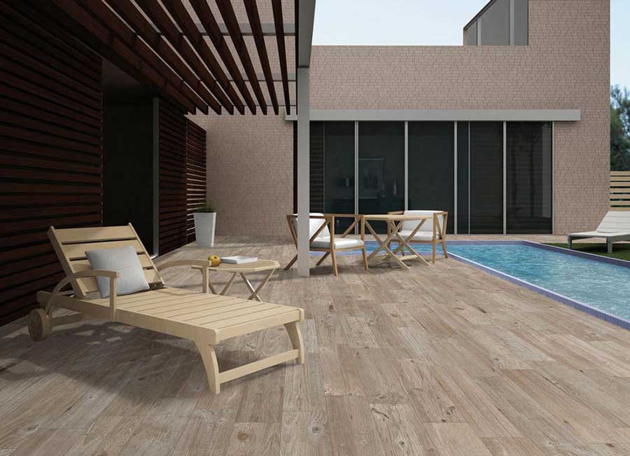 High-end porcelain tiles in the Stela collection have finishes inspired by the beauty of real wood. Even the smallest details on the surface seem lifelike. An excellent tile for outdoor recreation areas like pools. Rosa Gres Stela Golden is a wood-textured porcelain stoneware tile that is a perfect choice for anyone looking to add a touch of elegance to their swimming pool area. The tile's wood texture brings a natural and organic feel, while the porcelain stoneware material provides durability, slip-resistance, and low maintenance. The wood-textured design of Rosa Gres Stela Golden tile is an exceptional feature that creates a unique and warm atmosphere in your pool area. The texture of the tiles mimics the look and feel of real wood, without the maintenance or durability concerns. The natural and earthy look of the tile creates an inviting ambiance around the pool, making it a great place to relax and unwind. The Stela Golden wood-textured tile is available in different sizes and shades, making it customizable to any pool design or personal preference. The tile is versatile and can be used for pool decks, walkways, or poolside walls. The warm and inviting look of the tile creates a cozy and relaxing atmosphere, making it perfect for pool areas and outdoor living spaces.