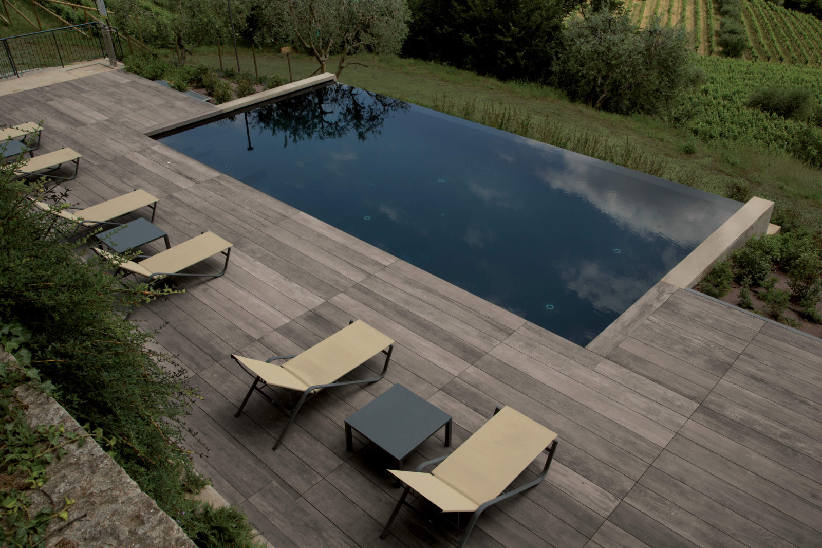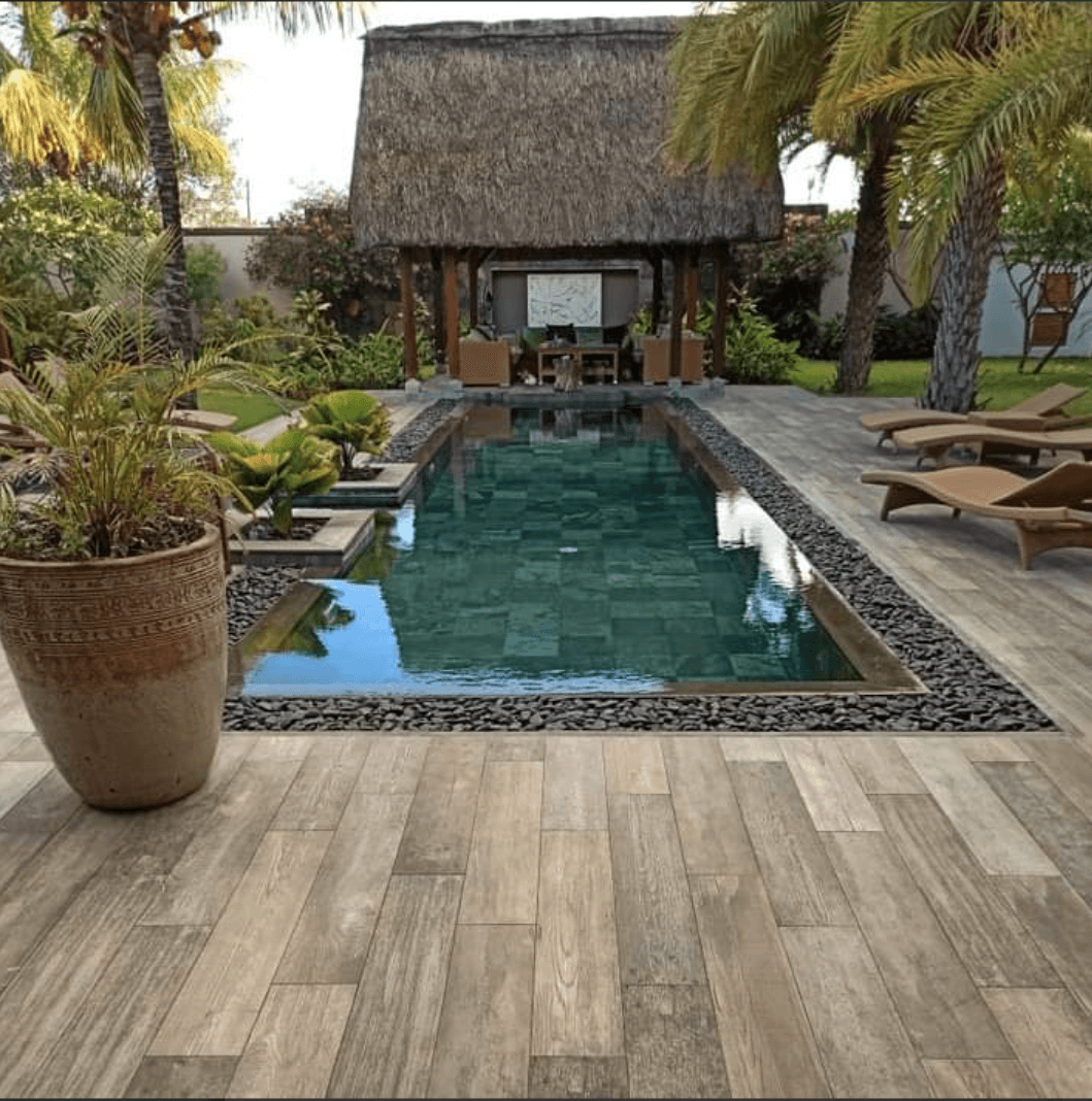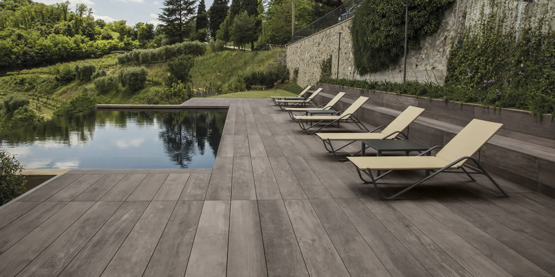 High-end porcelain tiles in the Stela collection have finishes inspired by the beauty of real wood. Even the smallest details on the surface seem lifelike. An excellent tile for outdoor recreation areas like pools. Rosa Gres Stela Grey is a wood-textured porcelain stoneware tile that is a perfect choice for anyone looking to add a touch of elegance to their swimming pool area. The tile's wood texture brings a natural and organic feel, while the porcelain stoneware material provides durability, slip-resistance, and low maintenance. The wood-textured design of Rosa Gres Stela Grey tile is an exceptional feature that creates a unique and warm atmosphere in your pool area. The texture of the tiles mimics the look and feel of real wood, without the maintenance or durability concerns. The natural and earthy look of the tile creates an inviting ambiance around the pool, making it a great place to relax and unwind. The Stela Grey wood-textured tile is available in different sizes and shades, making it customizable to any pool design or personal preference. The tile is versatile and can be used for pool decks, walkways, or poolside walls. The warm and inviting look of the tile creates a cozy and relaxing atmosphere, making it perfect for pool areas and outdoor living spaces.