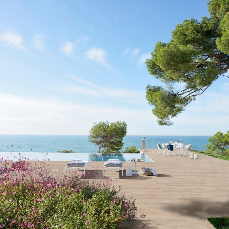 Rosa Gres Mistery Sand 665 porcelain stoneware edge for swimming pool, 62,6 x 62,6 x 2,6 cm, anti-slip Rosa Gres Mistery Sand 665 porcelain stoneware edge for swimming pool, 62,6 x 62,6 x 2,6 cm, anti-slip