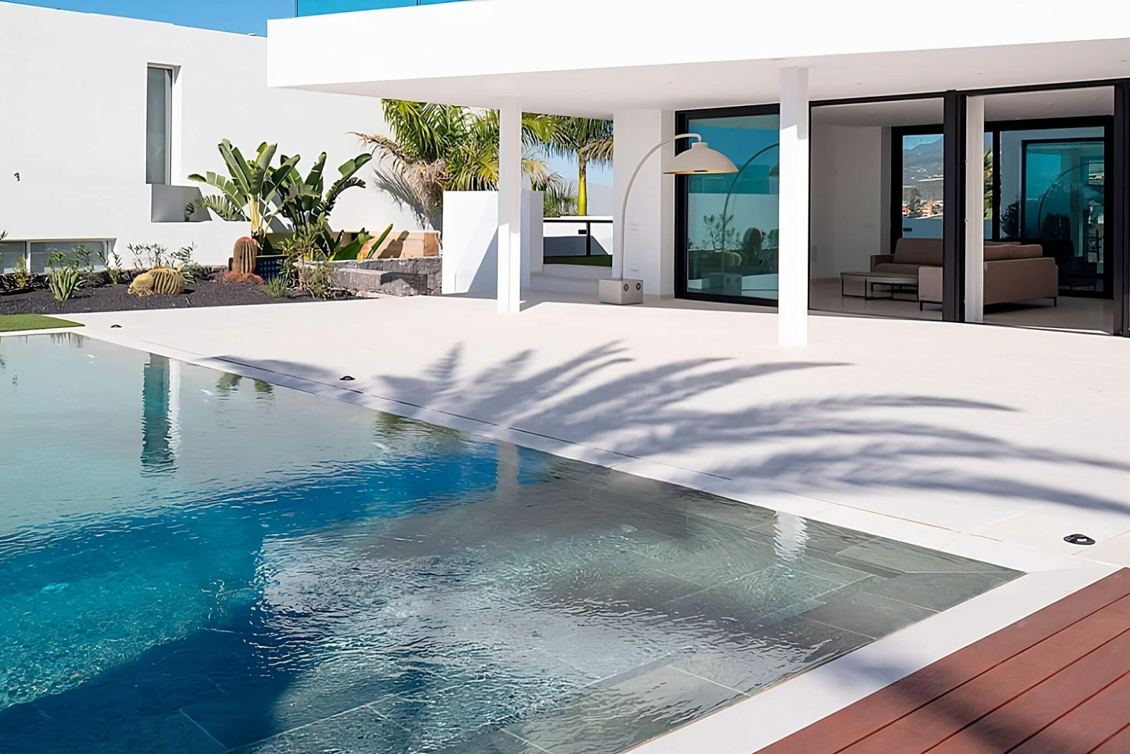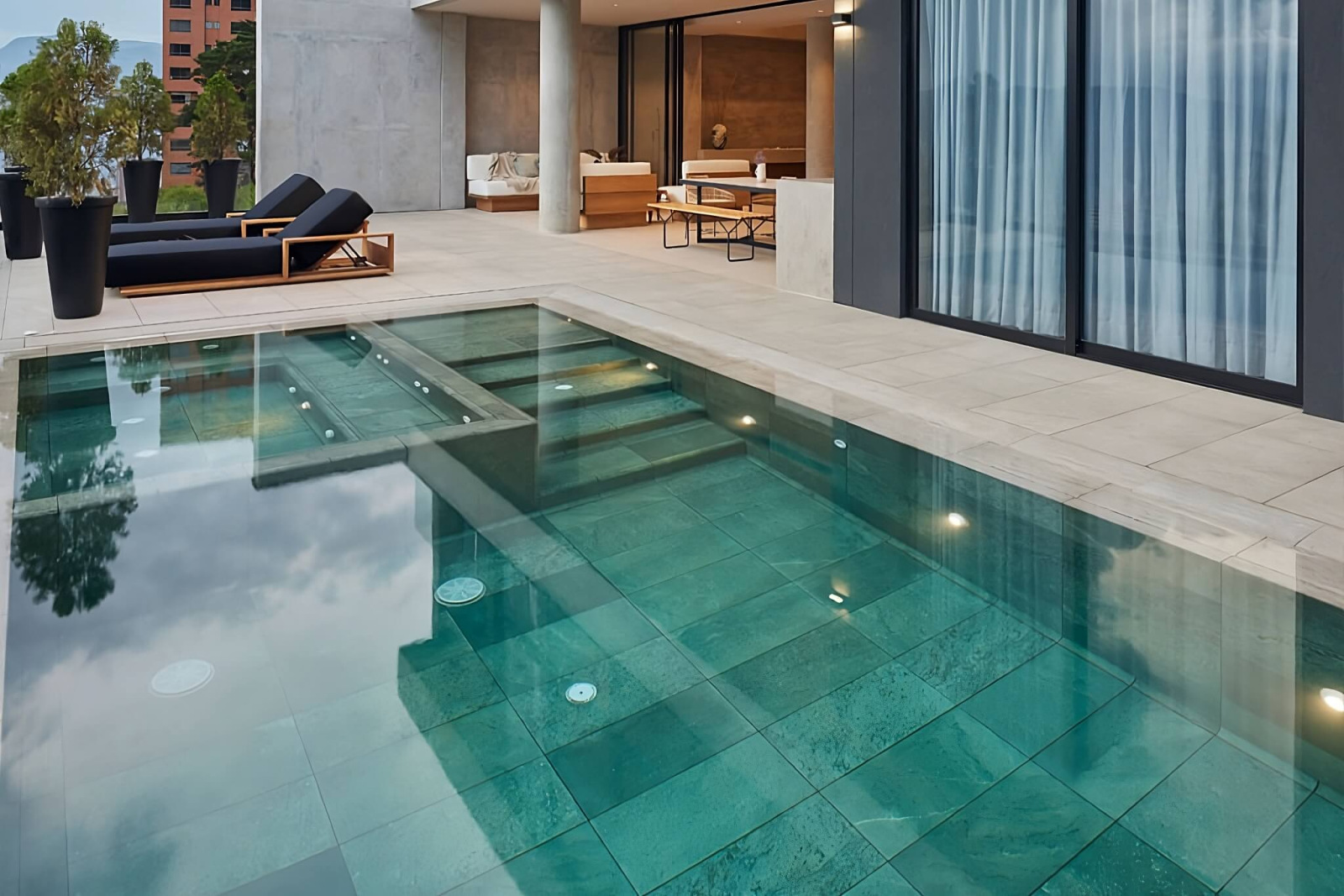 Pools with collector channels (with perimeter channel, overflow, and overflow) are fitted with non-slip porcelain stoneware edges.