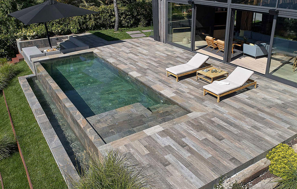 High-end porcelain tiles in the Alma collection have finishes inspired by the beauty of real wood. Even the smallest details on the surface seem lifelike. An excellent tile for outdoor recreation areas like pools. Rosa Gres Alma Mist is a wood-textured porcelain stoneware tile that is a perfect choice for anyone looking to add a touch of elegance to their swimming pool area. The tile's wood texture brings a natural and organic feel, while the porcelain stoneware material provides durability, slip-resistance, and low maintenance. The wood-textured design of Rosa Gres Alma Mist tile is an exceptional feature that creates a unique and warm atmosphere in your pool area. The texture of the tiles mimics the look and feel of real wood, without the maintenance or durability concerns. The natural and earthy look of the tile creates an inviting ambiance around the pool, making it a great place to relax and unwind. The Alma Mist wood-textured tile is available in different sizes and shades, making it customizable to any pool design or personal preference. The tile is versatile and can be used for pool decks, walkways, or poolside walls. The warm and inviting look of the tile creates a cozy and relaxing atmosphere, making it perfect for pool areas and outdoor living spaces.