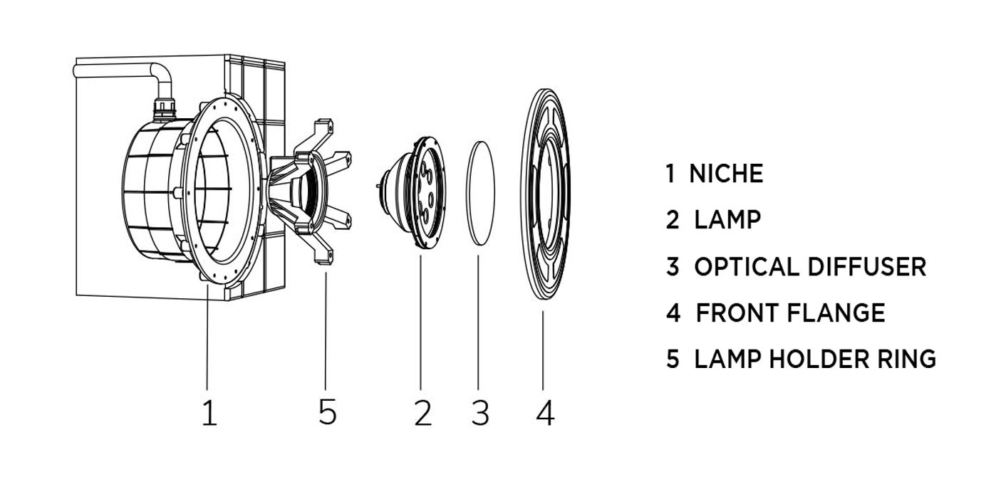 Brand: Elecro engineering,Lamp output, W: 110 (2 x 55) Category: Teclumen Par56 ECO power lamp with niche and cable for pool, 316L, cool white