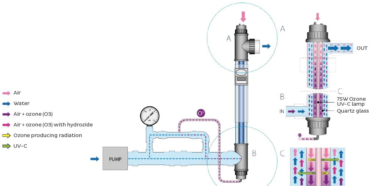 O3 in water will be residually corroded by UV-C, due to the creation of OH-cyano groups, which have a maximum degree of acidity. This makes it possible to eliminate natural negative elements in the water, while UV-C provides detox.