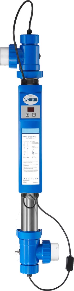 The VGE ionizer cleans your pool water by electrolytically releasing copper ions. The body of the ionizer contains copper electrodes that release small amounts of ions into the water flowing through the body.