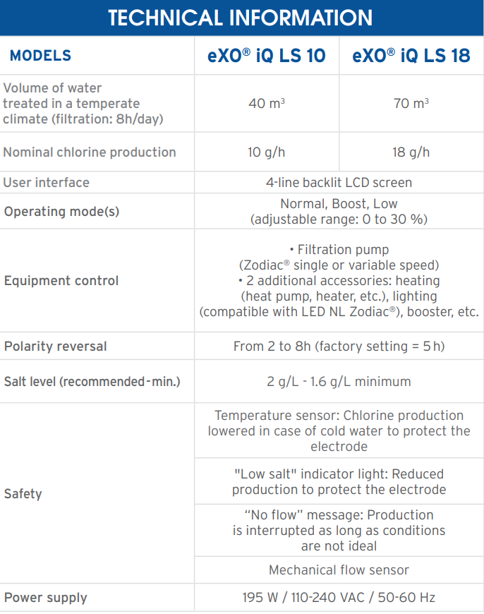 The Zodiac eXO iQ LS chlorinator is a cutting-edge device made to maintain swimming pools in excellent condition with little work. With its wealth of innovative features and remarkable advantages, this ground-breaking system makes maintaining pools simple and hassle-free. The remarkable self-cleaning feature of the eXO iQ LS chlorinator is what makes it so popular. It makes sure the system functions properly and increases its lifespan. The salt cell is maintained at maximum efficiency thanks to the clever design of the chlorinator, which also improves the system's general performance and makes sure that the chlorination process is always at its best. The Zodiac eXO iQ LS chlorinator is a revolutionary device that makes pool maintenance simple and produces excellent results. Its amazing array of features and advantages make it a top option for pool owners who want to take advantage of a clear, healthy pool with the least amount of work.